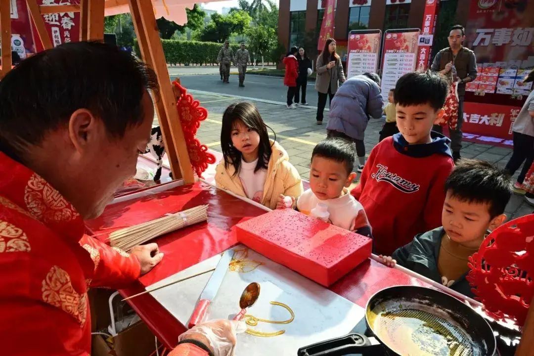 年货节的一角,公司特邀而来的书法家们正挥毫泼墨,写下一个个苍劲有力的“福”字和一幅幅对仗工整的春联,字里行间浸润着浓浓的军民鱼水情,饱含着海峡融合对人民子弟兵的美好祝福。
