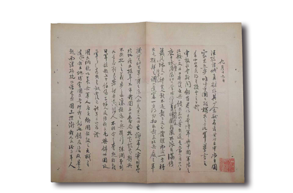 展出的藏品,图为1931年9月19日沈钧儒所写关于九一八事变的手稿