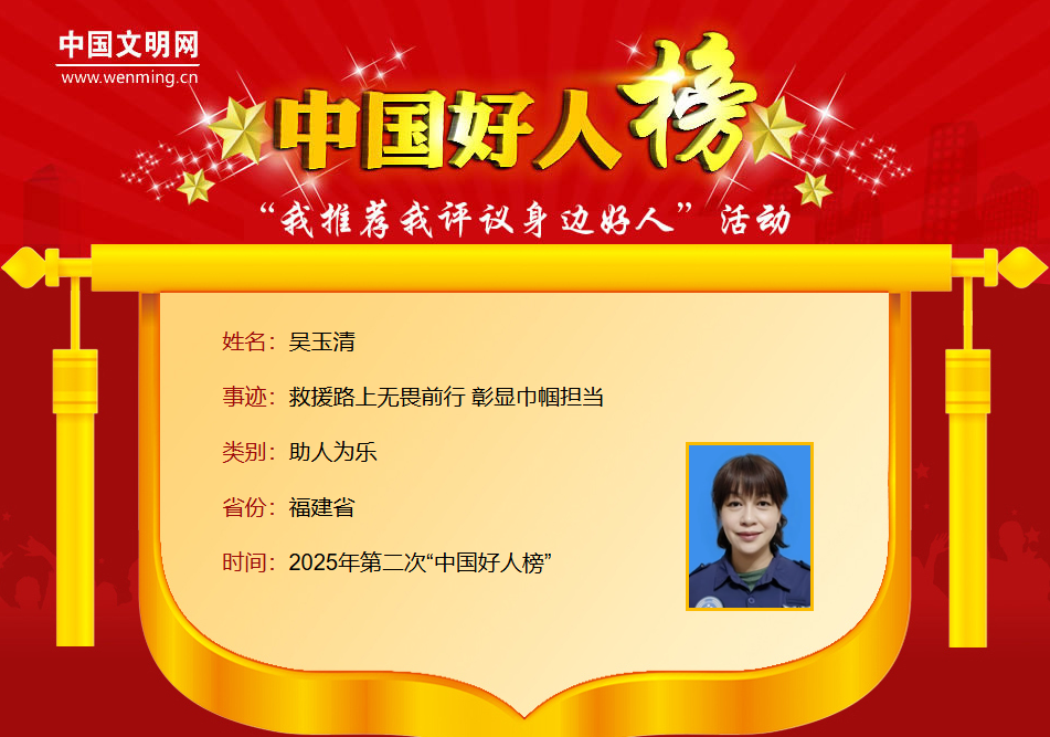 吴玉清,女,1972年11月出生,中共党员,福建省蓝天救援防灾减灾中心三明(三钢)队秘书长。2013年,吴玉清加入福建省蓝天救援防灾减灾中心三明(三钢)队。她先后参与了云南鲁甸地震救援、尼泊尔地震救援、斯里兰卡水灾救援等国内外突发事件救援任务,累计达125次,服务群众12700人。吴玉清曾荣获福建省五星级志愿者等荣誉。