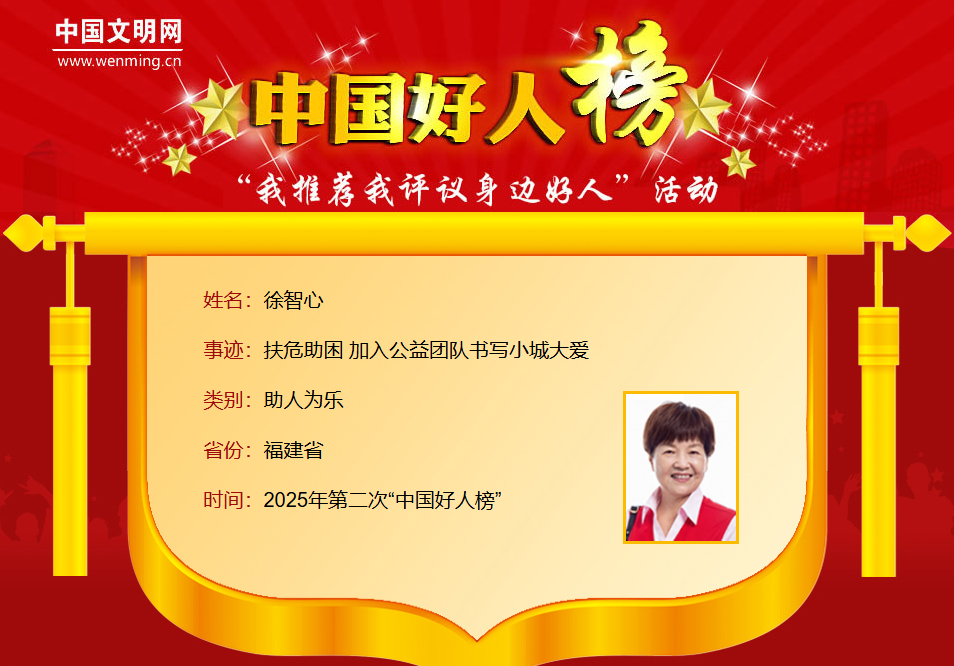 徐智心,女,1947年8月生,中共党员,福建省漳州市长泰区发展和改革局退休干部。自2002年退休至今的近23年里,徐智心始终以“扶贫助学助困”为主线,全身心投入到公益事业中,倾注了大量心血。2013年,她启动实施了“助学圆梦”项目,个人累计出资超过70万元,资助了长泰区300余名困难学子。2014年,她又开展了“星星点灯照亮我心”关爱残疾儿童项目,累计帮助了200多名残疾儿童。2016年,徐智心发起“产业扶贫”行动,为贫困户量身打造蛋鸡养殖和芙蓉李种植项目,助力他们脱贫增收。2024年,年近80岁的她主动请缨,担任“厝边妈妈”,与漳州市的5名困境儿童结成帮扶对子。徐智心曾获福建省扶残助残先进个人、“福建好人”等荣誉。