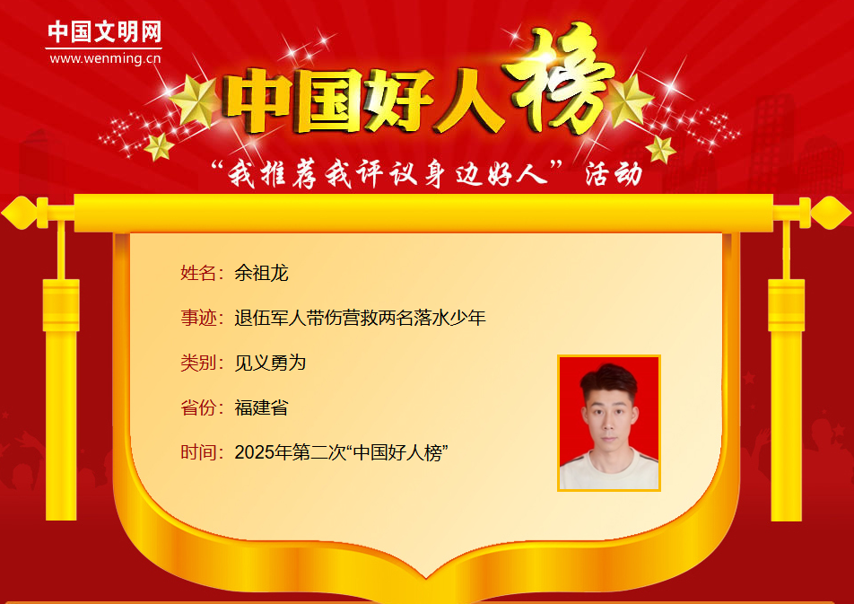 余祖龙,男,1993年7月生,福建省宁德市寿宁县芹洋乡广地村村民。2024年10月14日晚,余祖龙在散步时,听到有人呼喊,得知有两名少年不慎落入深水湖中。当时,余祖龙刚做完阑尾炎手术,伤口还未拆线,但他没有丝毫犹豫,毅然跳入冰冷刺骨的湖水中展开救援。救起第一名少年后,余祖龙已体力不支。然而,他咬紧牙关,转身又救起了第二名落水少年。10月17日,余祖龙跳水救人的英勇行为被寿宁县公安局和见义勇为协会认定为见义勇为。余祖龙曾获“优秀士兵”“训练标兵”等荣誉。