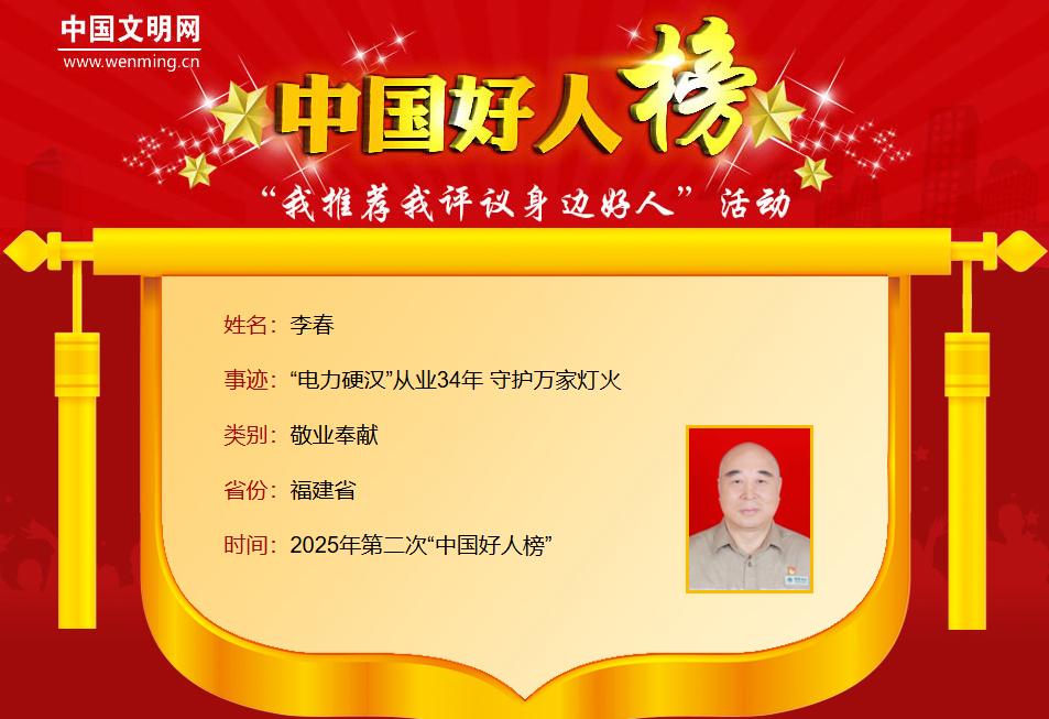 李春,男,1974年3月生,中共党员,国网厦门供电公司城市供电服务分公司第三党支部书记兼抢修突击队队长。李春扎根电力抢修一线长达34年,始终践行“让灯先亮起来”的誓言。他工作认真负责、爱岗敬业,勇于创新、乐于奉献,累计参与过400多项重大活动的保电工作,以及重大抢险救灾和重大抢修任务。李春曾获全国劳动模范、全国五一劳动奖章、福建省最美劳动者等荣誉。