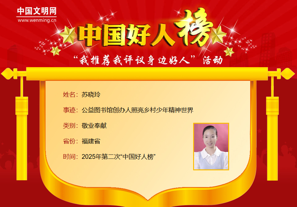 苏晓玲,女,1981年2月生,中共党员,福建省南安市图书馆阅读推广活动部负责人、“好读书”公益图书馆创办人。十余年来,苏晓玲与同伴们深耕公益图书领域,齐心协力在南安市成功筹建并运营了28家“好读书”公益图书室。他们举办了超过一千场阅读活动,累计帮扶了八万多名青少年,用知识为无数孩子开启了智慧之门。目前,这28家公益图书室总面积超过4500平方米,藏书总量已达13万余册,年均接待读者超过25万人次。苏晓玲曾获乡村阅读推广人、福建省全民阅读优秀阅读推广人等荣誉。