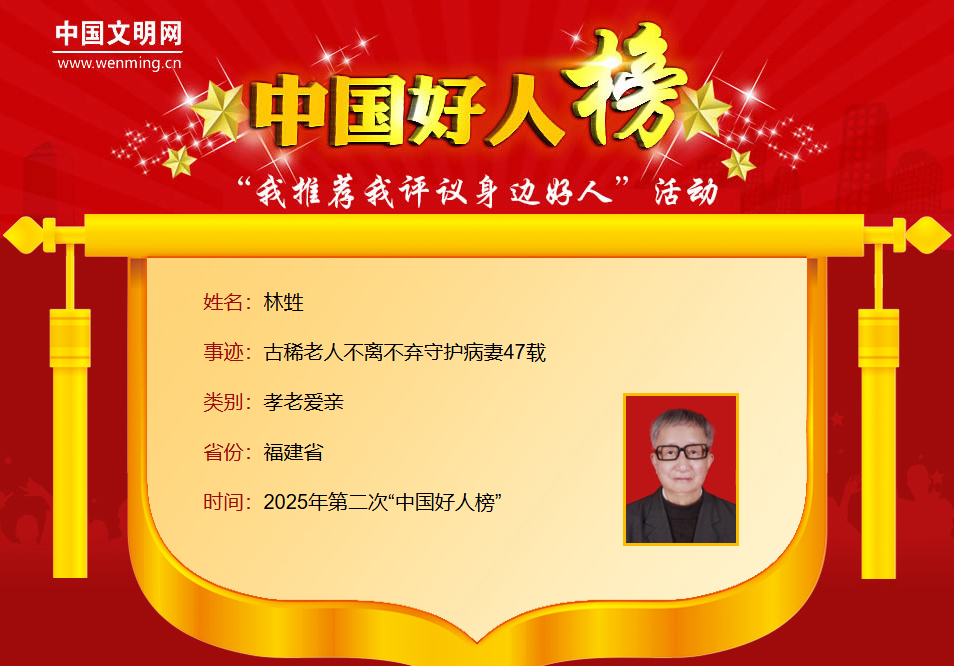 林甡,男,1946年8月生,福建省福州市鼓楼区五凤街道屏西社区居民。47年来,林甡精心照料瘫痪在床、常年卧病的妻子,用实实在在的行动和质朴的爱,守护着家人,为家人营造了一个温暖的港湾。