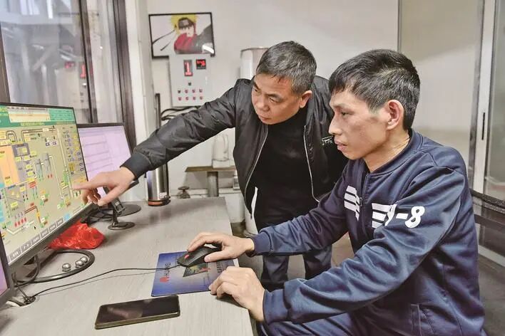 谢天中(左)与郭先富在电脑前查看锅炉情况。