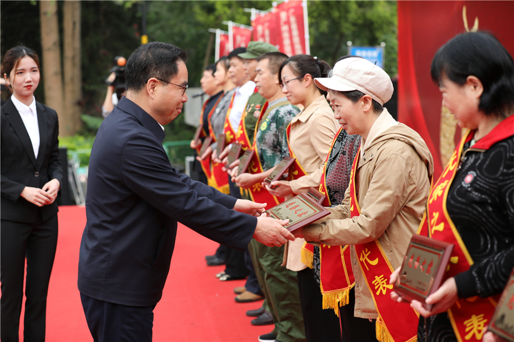 悬挂光荣牌仪式上,安徽副省长张曙光、省退役军人事务厅厅长林海等领导与服务对象合影