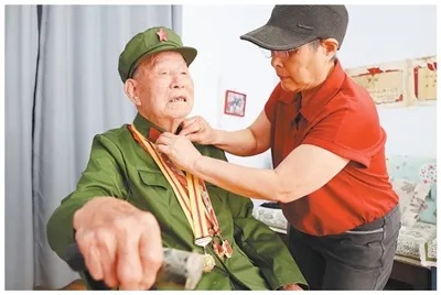 老人家中,陈设简单,客厅醒目处摆放着一张戎装照。照片里,老人精神矍铄,胸前挂着的一枚枚勋章闪闪发光,无声诉说着那段烽火岁月。