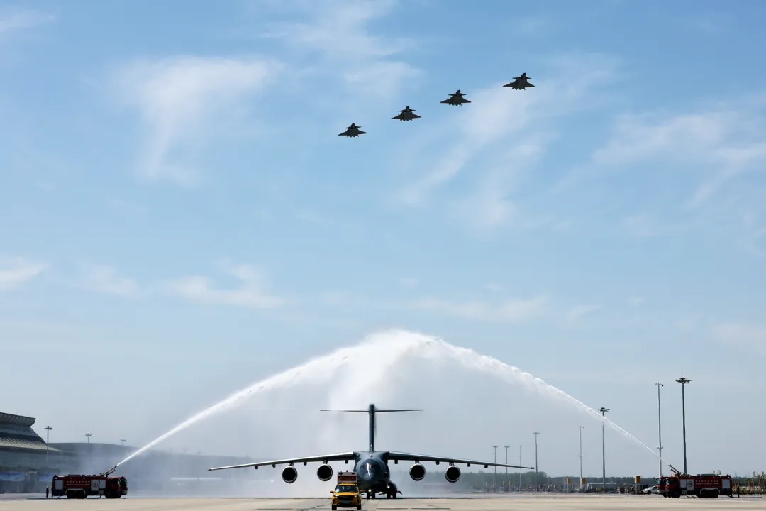 4月22日上午,空军专机运-20B降落在辽宁沈阳桃仙国际机场。沈阳桃仙机场以“过水门”航空最高礼仪迎接志愿军烈士遗骸回家,4架歼-20战斗机通场致敬。 曹舒昊 摄