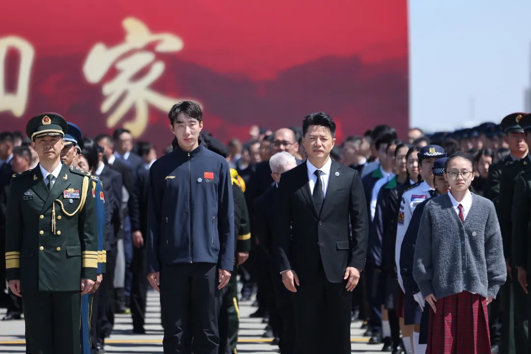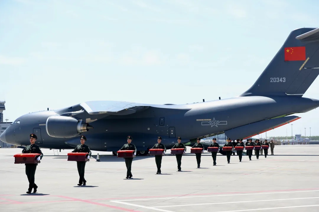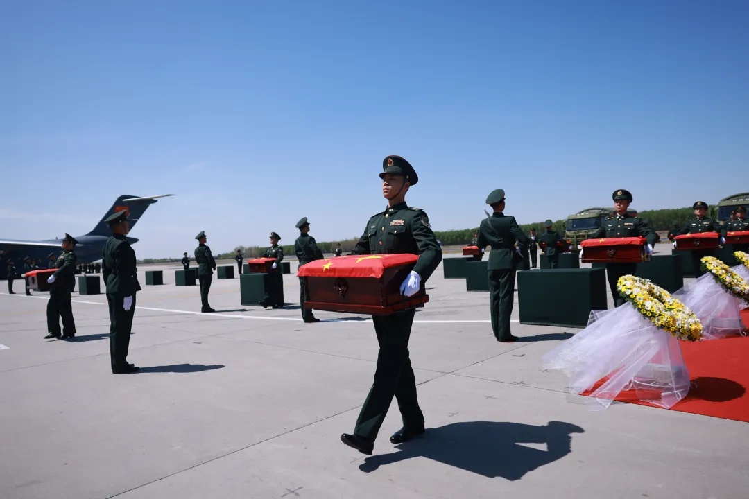 仪式现场庄严肃穆,礼兵双手捧起覆盖着鲜艳五星红旗的志愿军烈士遗骸棺椁,缓步走下专机,整齐安放于指定位置。解放军官兵军容严整、持枪伫立,以挺拔的军姿守护着英烈忠魂。现场全体人员向烈士遗骸行三鞠躬礼,深切缅怀先烈功绩,寄托无尽哀思。