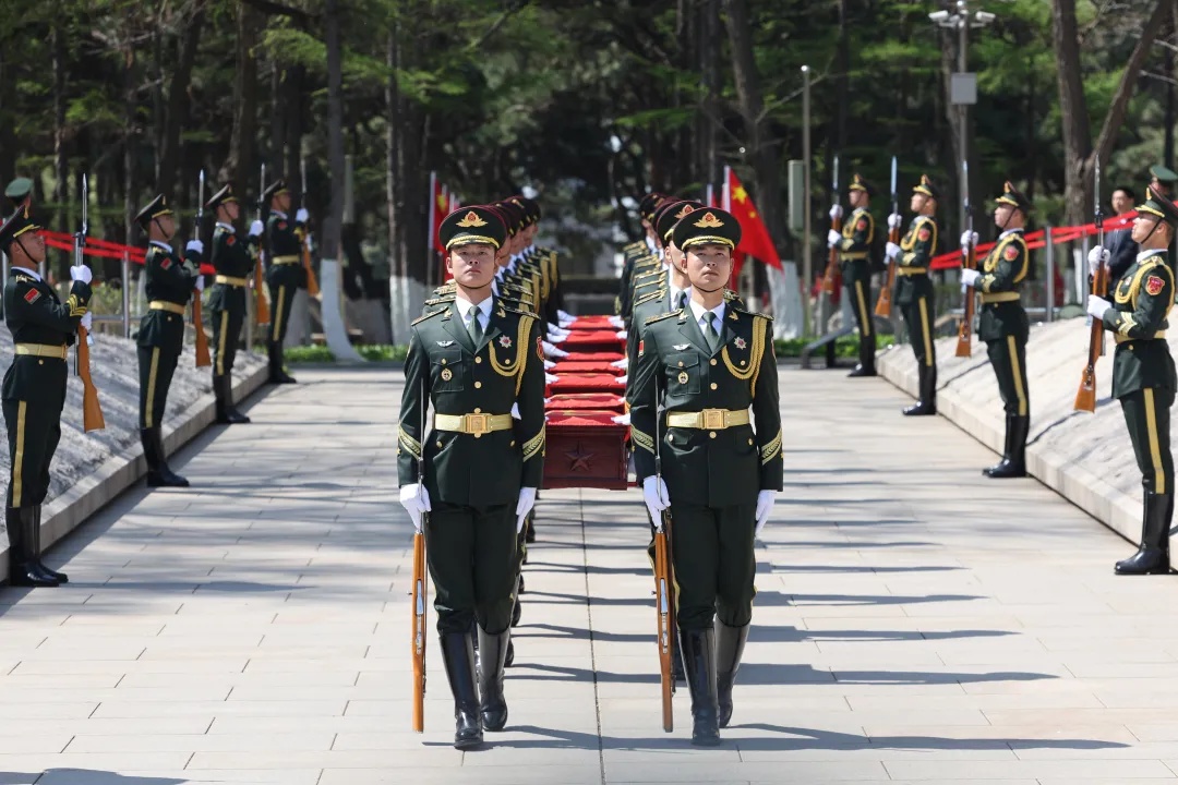 祖国和人民始终没有忘记先烈们的历史功勋,隆重举行安葬仪式正是对先烈们的深切缅怀和庄严纪念。陵园下沉式纪念广场环形烈士英名墙下摆满了黄白相间的菊花,参加仪式的人们列队整齐,肃穆站立。上午10时,仪式正式开始,军乐队奏响婉转低回的《思念曲》,在解放军仪仗司礼大队官兵持枪护卫下,礼兵们迈着整齐的步伐,护送志愿军烈士棺椁缓步进入纪念广场,全场奏唱中华人民共和国国歌。国歌唱毕,全体人员垂首默哀。裴金佳致祭文后,全体人员向志愿军烈士三鞠躬。27名礼兵连续鸣枪12响,以鸣枪礼向志愿军烈士致以最崇高敬意。