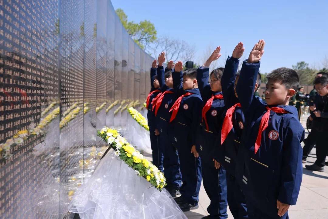 参加安葬仪式的社会各界代表向烈士献花致敬,并瞻仰烈士英名墙。图为江苏省泰兴市根思实验学校少先队员在烈士英名墙前献花、敬礼。曹舒昊 摄