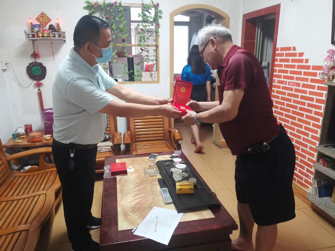 同一天,漳浦县退役军人局、官浔镇同步举行“光荣在党50年”纪念章颁发仪式,为商茂土、王水川等10名老党员颁发纪念章。仪式结束后,朱艺辉局长带领老党员们重温入党誓词,坚定跟党走的决心,全体参会人员纷纷表示要时刻用入党誓词对标自身,警醒自己,用更加饱满昂扬的工作态度和更加踏实稳重的工作作风,为退役军人工作作出贡献,以更好的成绩迎接建党一百周年。