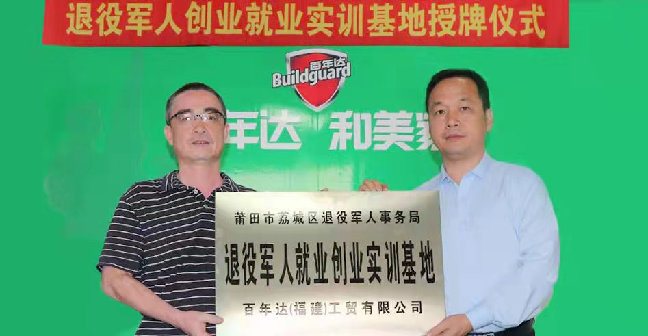 张志芳对部队一直有着深厚的感情,百年达也始终把退役军人放在突出位置,积极扶持退役军人就业创业。公司现有退役军人员工26人,其中副团职自主择业退役军官3人,扶持退役军人创业28人,安排退役军人就业300多人,在现有几十位退伍军人经销商、员工的基础上,还在继续壮大退役军人团队,公司所有岗位招聘时优先录用退役军人。对创业的退役军人在政策上和经济上给予大力扶助,长年全程免费技术培训,全国300多家代理专卖店,其中公司特殊扶持的退役军人创业代理店占三分之一。企业完善独特军旅企业文化,设有退役军人之家,定期组织员工进行基本军事训练,开展爱党、爱国、拥军教育活动。