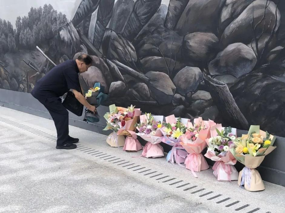 在巨幅彩绘墙前,老将军们认真聆听“厦门湖里神山插上第一面新中国国旗”的故事,他们驻足久久凝望后,将手里鲜花献给各位英烈,致以哀思,缅怀先烈精神。