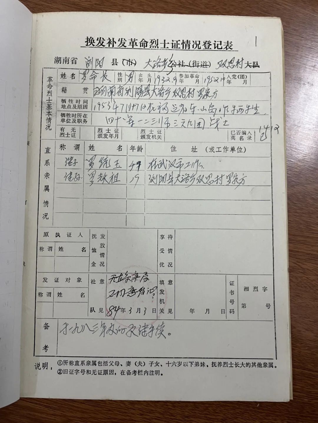 罗命长 湖南省浏阳县26区桥头乡7组 第4野战军步兵365团3营7连战士