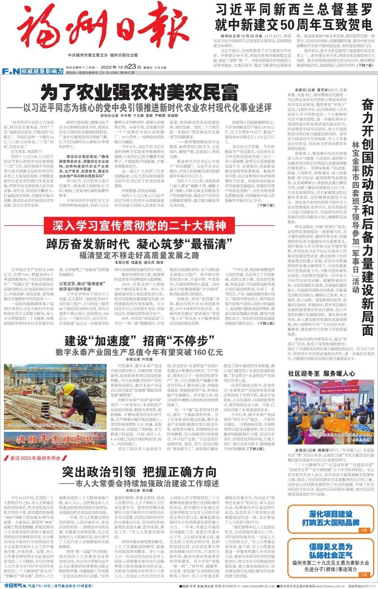 12月22日,省委常委、福州市委书记、福州警备区党委第一书记林宝金率市四套班子领导来到省军区综合训练场,集体参加“军事日”活动,与部队官兵、民兵预备役人员共同深入学习贯彻党的二十大精神和习近平强军思想,进一步强化领导干部国防意识和党管武装的政治担当,巩固增进军政军民团结,奋力开创国防动员和后备力量建设新局面。省军区少将副司令员郑福源、福州市人大常委会主任张忠、福州市政协主席刘卓群等军地领导参加。