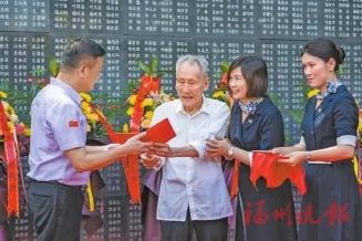 抗日老兵(左二)为抗日志士后人(左一)颁发福州抗日志士纪念墙荣誉证书