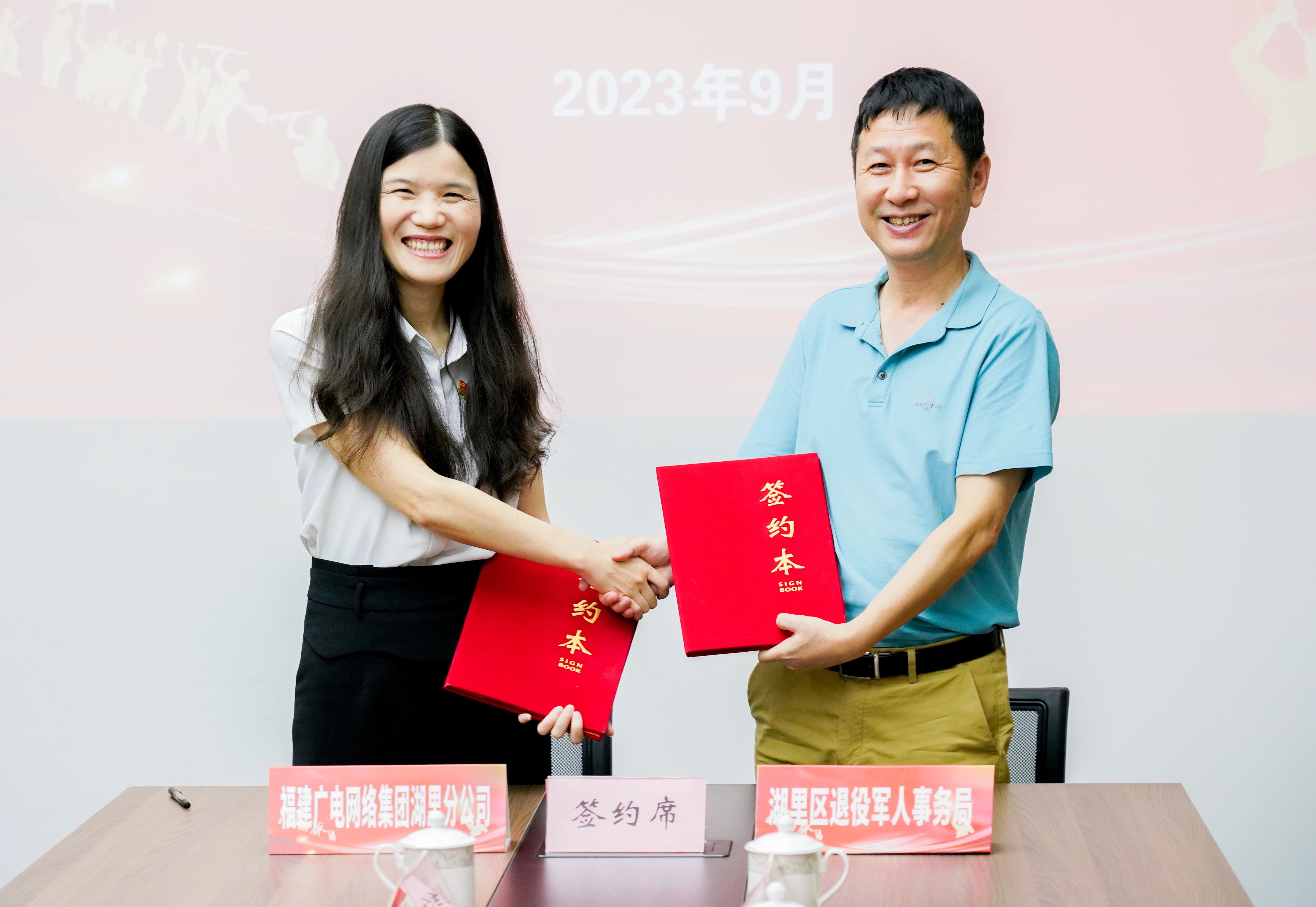 湖里区退役军人事务局局长郑朝东(右)与广电网络湖里分公司总经理蔡琼瑛(左)签署合作协议