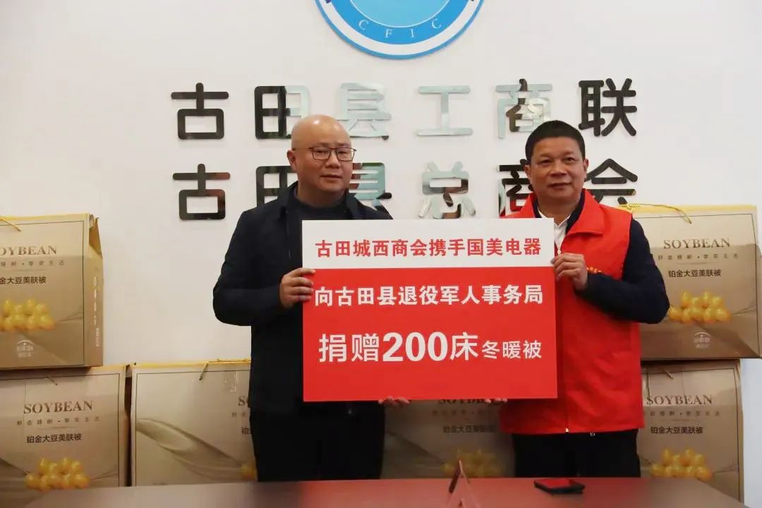 捐赠仪式上,城西商会携手国美电器向古田县退役军人事务局捐赠200床被子,并发放拥军惠民券200万元。