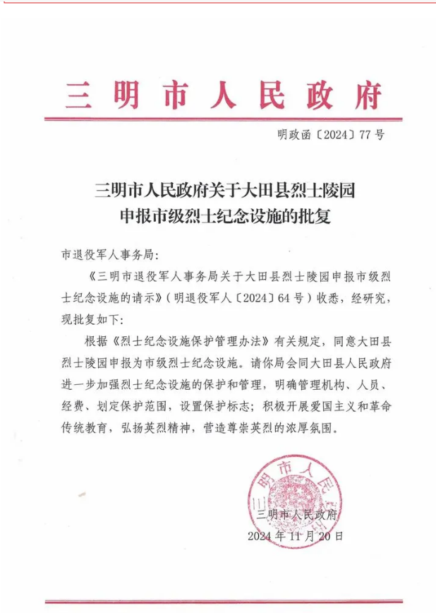 11月20日,三明市人民政府批准大田县烈士陵园为市级烈士纪念设施。