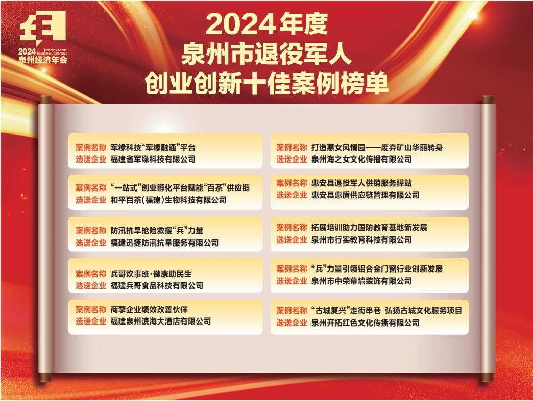 为进一步展示泉州市退役军人创业创新成果,发挥示范引领作用,今年年初,由市退役军人事务局牵头推进的“创业泉城·戎耀刺桐”2024年度泉州市退役军人创业创新十佳案例推选活动正式启动。经过广泛发动、严谨的初审及终评,十个退役军人创业创新典型案例脱颖而出,荣登“泉州市退役军人创业创新十佳案例”榜单,在2024泉州经济年会上予以发布。