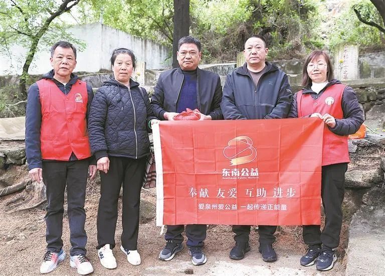 上午8点多,江尧富、徐长明、李金红3人带着祭品和鲜花,在奎生山下路口与泉州市丰泽区退役军人事务局工作人员、“我为烈士来寻亲”福建志愿服务队志愿者、东南公益协会的志愿者会合。原本集合时间定在上午9点,但是烈士的亲人抑制不住思念的情愫,凌晨三四点就从过夜歇息的福州连江启程奔赴泉州,提早到达。