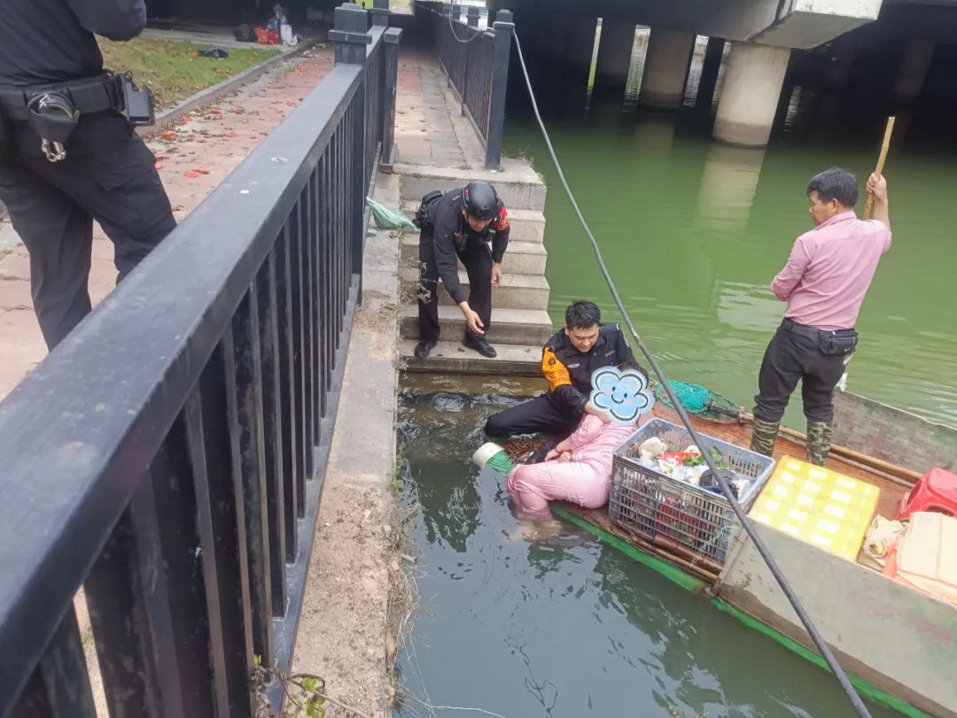 危急关头,庄亦鸿大喊一声:“来不及了,我会游,我来!”他迅速卸下执勤装备,纵身跃入河中,奋力游向落水者。与此同时,队友林禹川立即拨打110和120求助,并呼叫附近清理河面的市民协助救援。热心市民将竹竿伸向落水女子,帮助她稳定身形。随后,漳州110警组也赶到现场。在多方协作下,女子在十分钟内被成功救起,经120检查确认无碍。