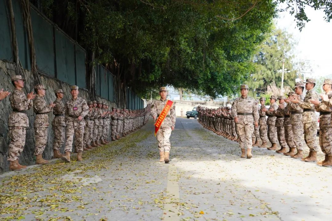 身披绶带,阔步走入营区。