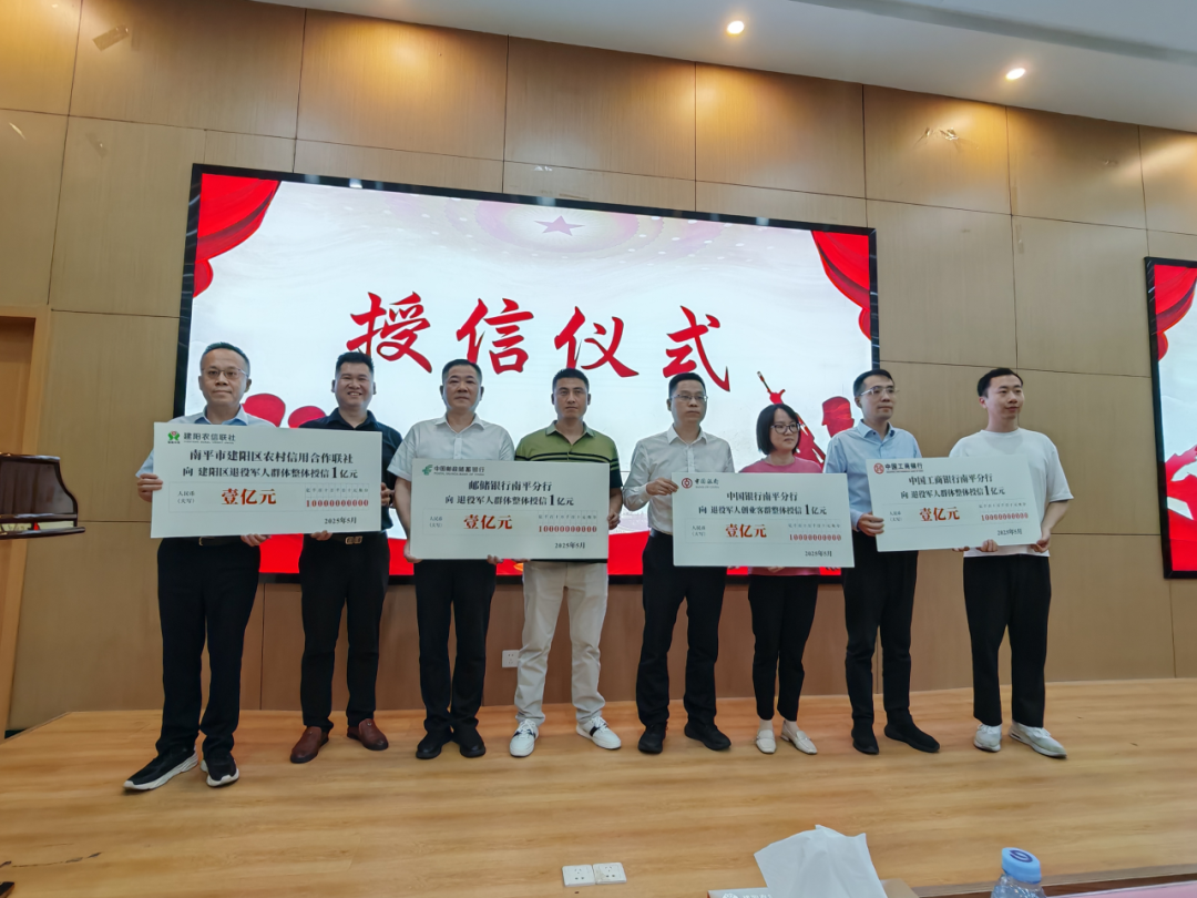 南平市退役军人事务局、南平金融监管分局等有关领导致辞,希望金融机构对退役军人创业提供更大的金融支持。授信仪式上,工商银行南平分行、中国银行南平分行、邮储银行南平分行、建阳农信联社分别为南平市退役军人群体授信1亿元,共计4亿元。这是继2021年南平市退役军人事务局与邮储银行南平分行为退役军人创业者授信10亿元后再次追加的授信额度,体现了金融机构对退役军人创业的坚定信心与大力支持,为退役军人创业注入强大资金动力。
