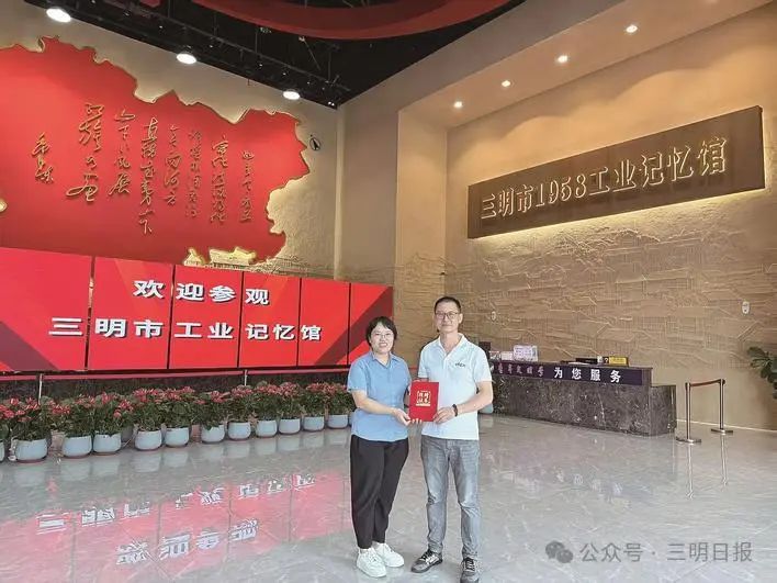 三明市1958工业记忆馆馆长郑碧玉给罗东平(右)颁发捐赠荣誉证书