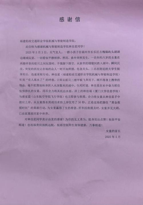 “他救的不仅仅是一条生命,更是一个家庭。”5月15日,被救儿童的家属董先生将题为“挺身而出见义勇为”的锦旗和一封感谢信送到福建船政交通职业学院的退役大学生士兵林佳星手中,感谢他勇救落水儿童的义举。