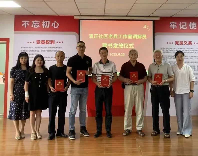 6月26日上午,泉州市鲤城区鲤中街道清正社区举行“老兵工作室”揭牌暨“老兵工作室调解员”聘书发放仪式,鲤城区退役军人事务局主要领导、鲤中街道分管领导及鲤中街道各社区退役军人服务站负责人、退役军人代表等参加仪式。