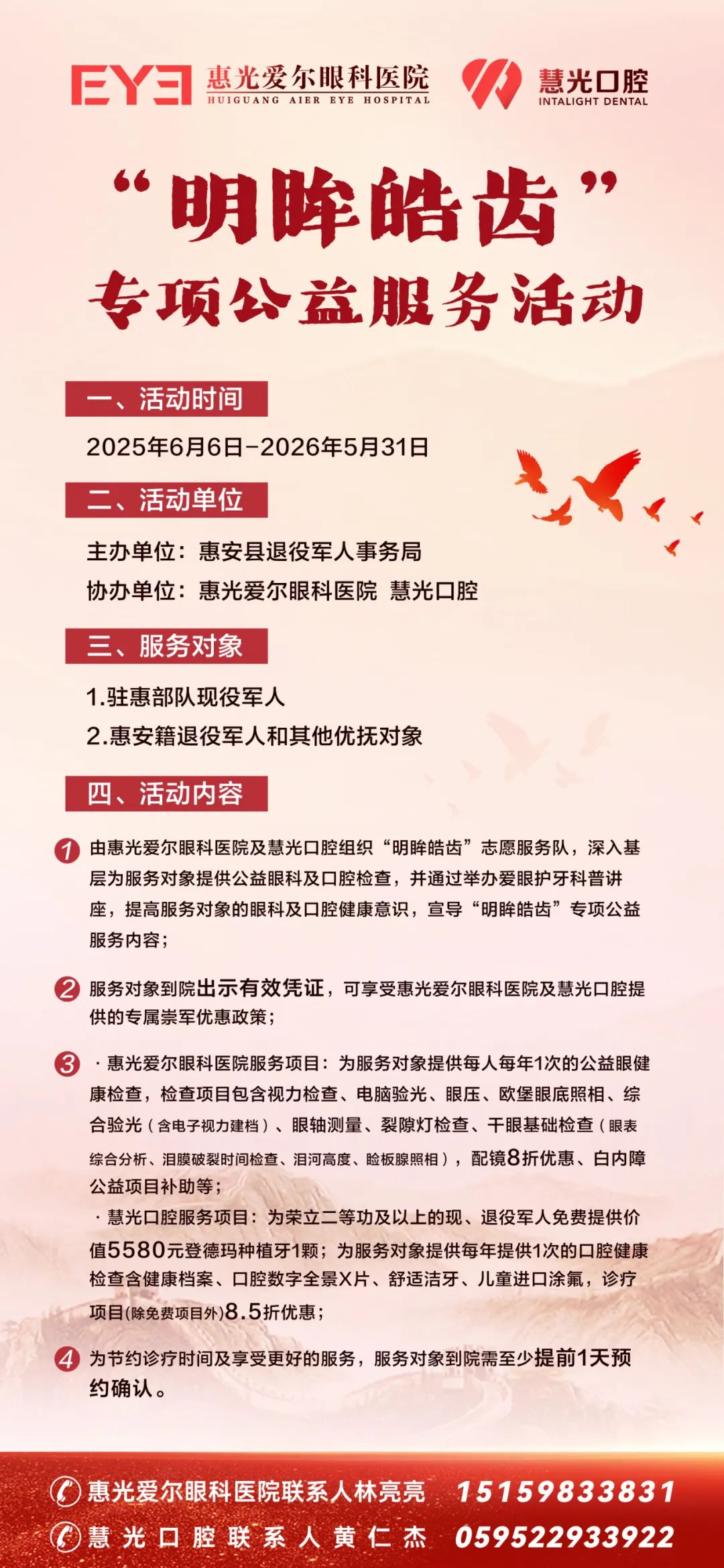 据了解,6月6日起,惠安县拥军专科医院以“明眸皓齿”为主题推出专项公益活动,为符合条件的军人军属、退役军人和其他优抚对象提供专属优惠政策。