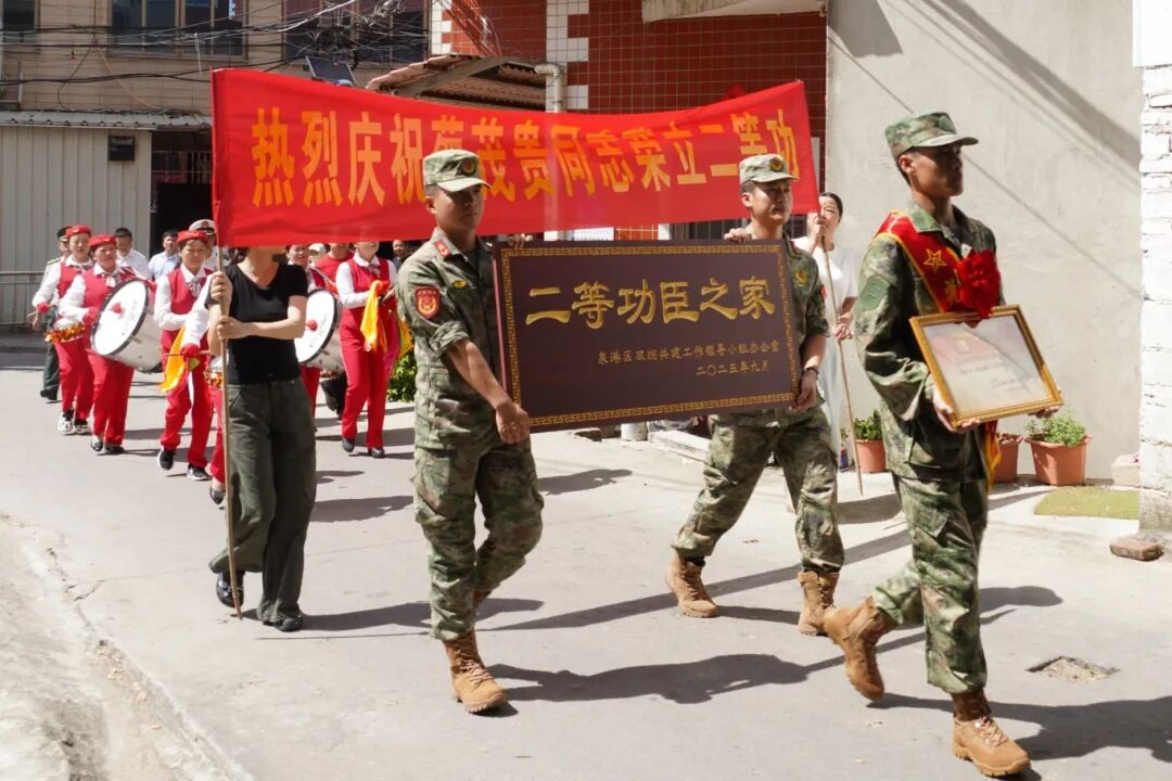 活动现场,气氛热烈,泉港区人武部部长何晨凡现场宣读了蔡茂贵同志二等功喜报,泉港区政府副区长朱添洪郑重地为蔡茂贵父母佩戴绶带、送上鲜花,泉港区委常委、区人武部政委熊洪向蔡茂贵父母送上立功慰问金。在热烈的掌声中,送喜报队伍还为蔡茂贵家属送上“二等功臣之家”牌匾,党和政府对功臣及其家属的关怀和敬意,传递到现场每个人的心中,邻里乡亲们纷纷投来赞许的目光,为这份荣耀感到由衷的自豪。