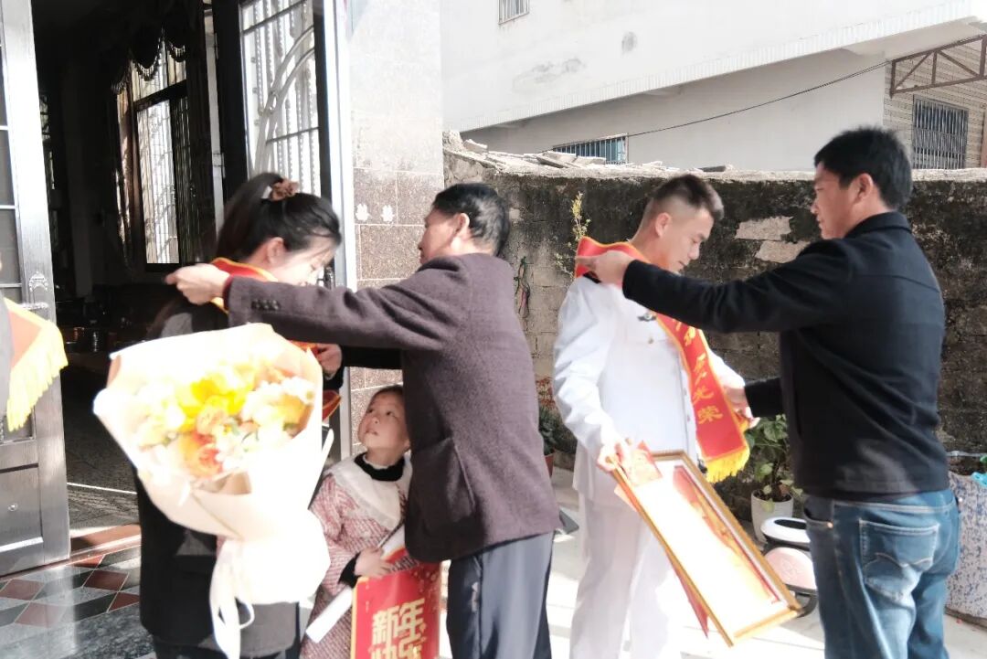 为弘扬拥军优属、拥政爱民的优良传统,营造尊崇军人、关爱军属、支持国防的浓厚氛围,诏安县人武部、县退役军人事务局联合桥东镇武装部、退役军人服务站组成慰问组,逐一走进七位立功军人的家庭,将烫金的喜报、慰问金和“一人立功,全家光荣”的荣誉绶带送到军属手中。锣鼓声声、鞭炮阵阵,每户家中都洋溢着自豪与欢乐。