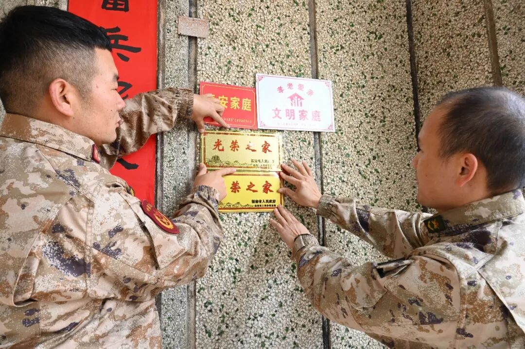 走访人员一进门,便纷纷行动起来:有的悬挂“我陪军属过大年”横幅,有的更换破旧“光荣之家”牌匾,有的张贴红彤彤的福字与春联,院中还挂起了象征团圆的小红灯笼。没多久,小院被点缀得喜气盈盈。
