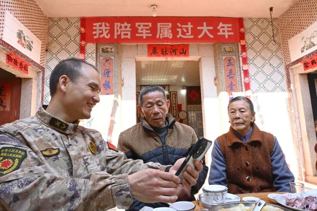 午餐时分,众人围坐一堂。刘福水非常高兴,他说,孙子入伍后,家里过年略显冷清,“今年不一样了,这么多人来到家里慰问。当军属,很光荣!”“你们守护国家,我们照顾好家乡!”正在此时,镇武装部部长吴毅强拨通了在南部战区某部服役刘星烨的电话,一句朴素的话,道出了真挚的军民情。