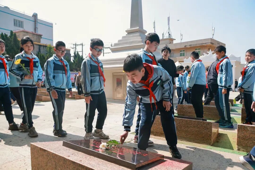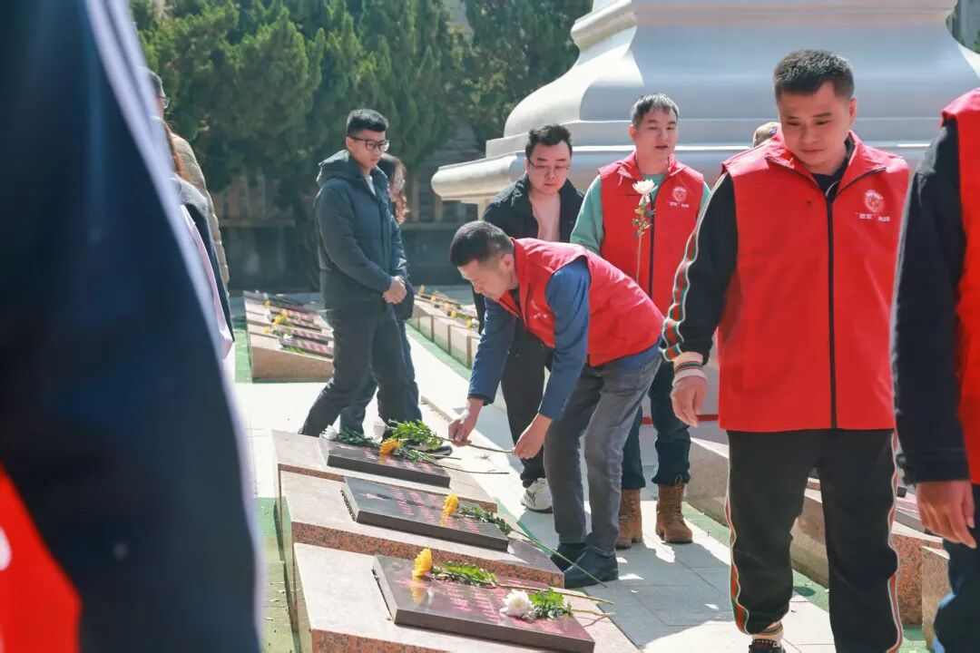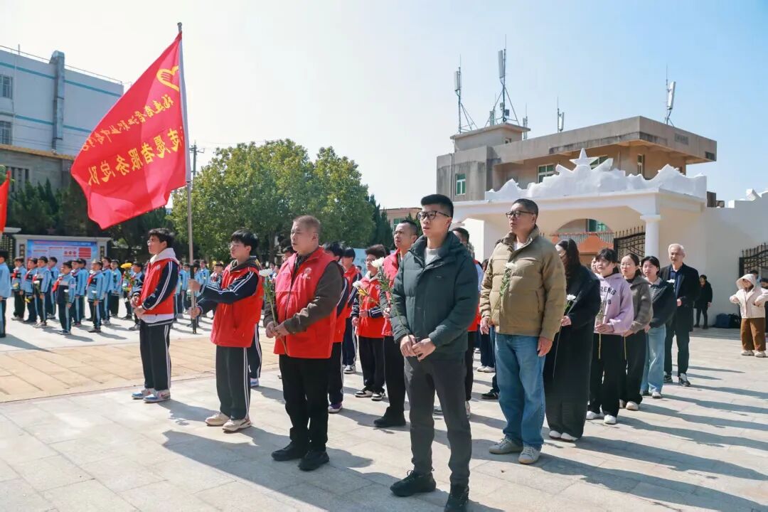 随后,全场人员怀着无比崇敬的心情,向长眠于此的革命先烈默哀,深切追思他们为民族独立、人民解放抛头颅、洒热血的峥嵘岁月。默哀毕,师生代表缓步走向烈士纪念碑,敬献花圈,寄托对英烈的深切哀思。全体人员有序上前,手持鲜花,依次敬献至纪念碑前,朵朵鲜花承载着对先烈的缅怀与敬仰。
