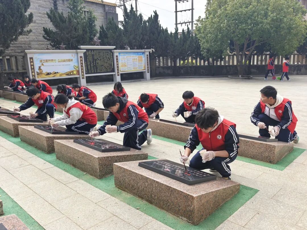 志愿者们与师生代表一同拿起工具,细心擦拭烈士墓碑,为墓碑上的五角星描摹朱红,以指尖温度触碰英雄记忆,让红色印记愈发鲜亮。一笔一画,是对英烈英名的铭记;一抹鲜红,是跨越时空的精神对话,大家以实际行动表达着继承先烈遗志、勇担时代使命的坚定信念。