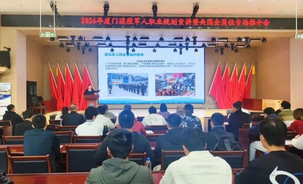 3月24日上午,厦门市退役军人事务局会同专业求职机构在军休大厦举办2026年退役军人职业规划宣讲暨央国企岗位专场推介会,厦门市80余名春季退役士兵参会。