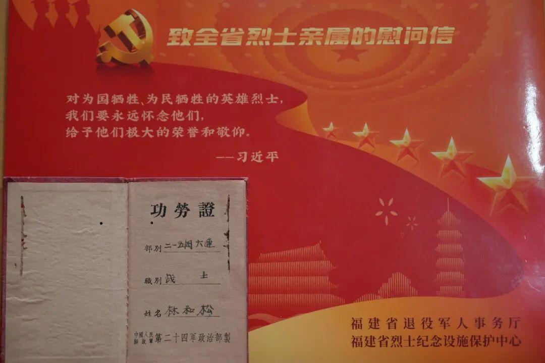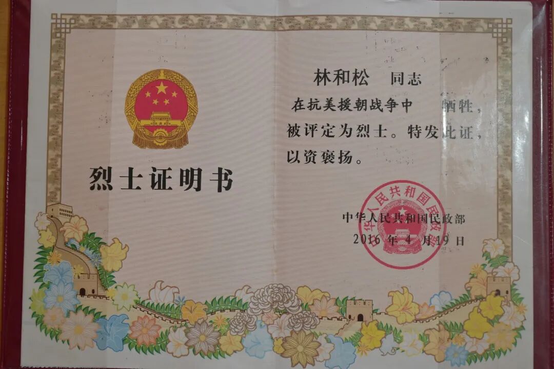 林树林的父亲林和松,是一位用生命捍卫家国的革命烈士。1917年出生,1946年入伍(档案记载),1949年4月任24军72师215团6连副班长,1950年随军跨过鸭绿江参加抗美援朝战争。因作战英勇、意志坚定,他仅用三年时间就成长为副连长,并曾荣获三等功一次、四等功两次。