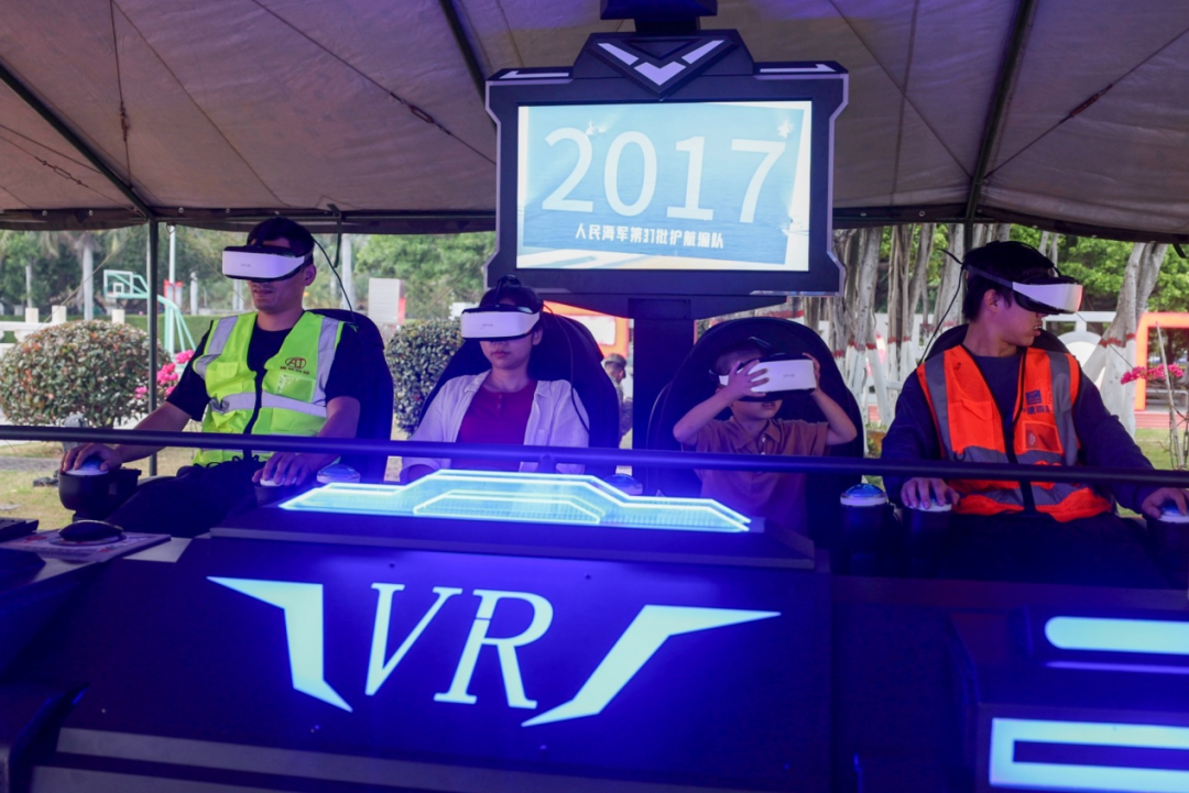 为了增强参观趣味性,该部队还特别制作了VR视频,邀请他们戴上VR眼镜,身临其境体验航母飞行员惊险刺激的着舰训练。
