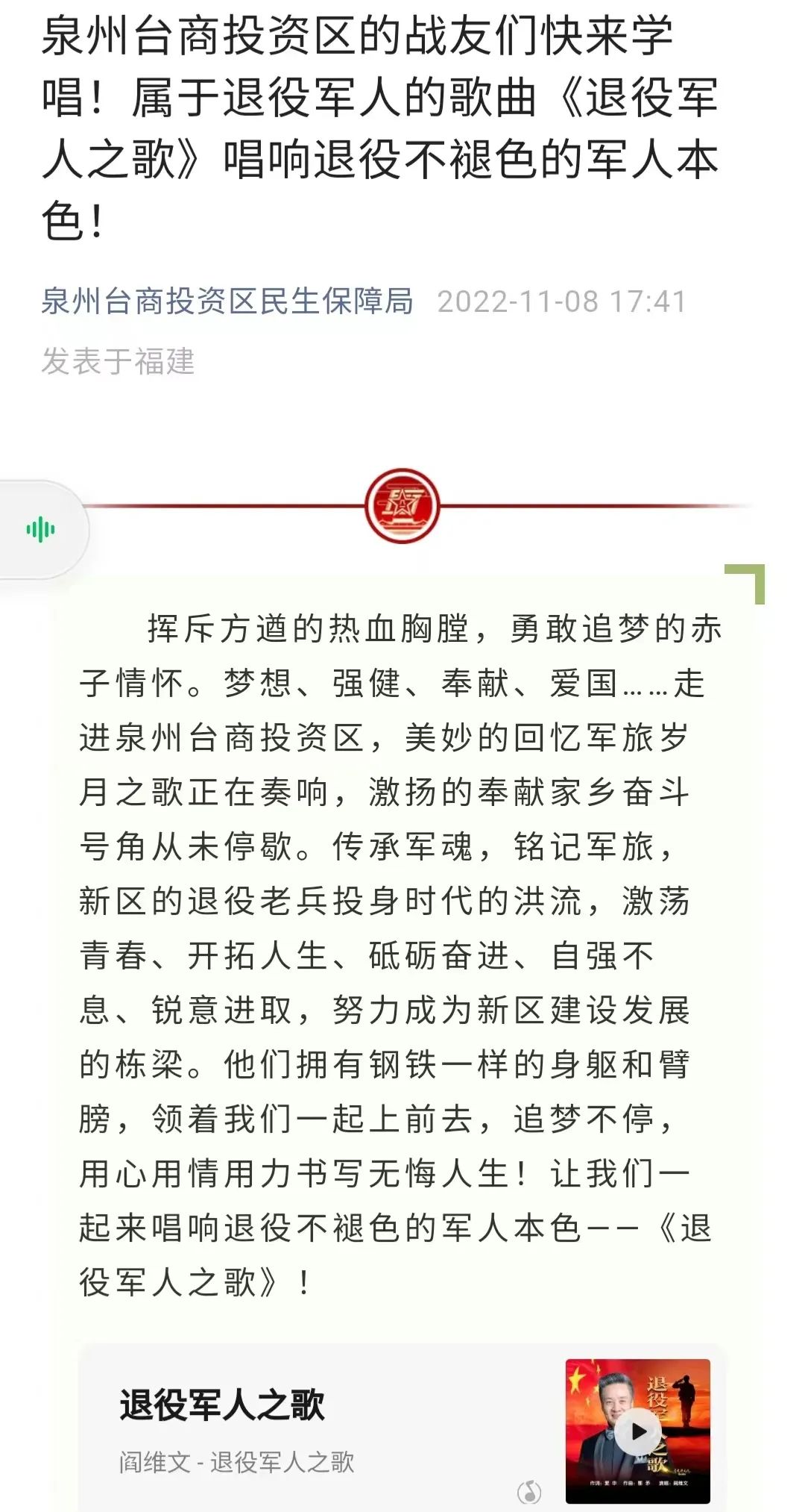 泉州台商投资区利用全区多个官方权威和民间自发的微信公众号大力宣传《退役军人之歌》的音频和歌谱、歌词。旋律深情高亢,歌词激昂豪迈,在广大退役军人群体中引发强烈的情感共鸣。全区广大退役军人和退役军人事务系统工作者共同学唱、接力传唱,以此表达听党话跟党走、若有战召必回的军人品质和奋进新征程、建功新时代的坚定决心。