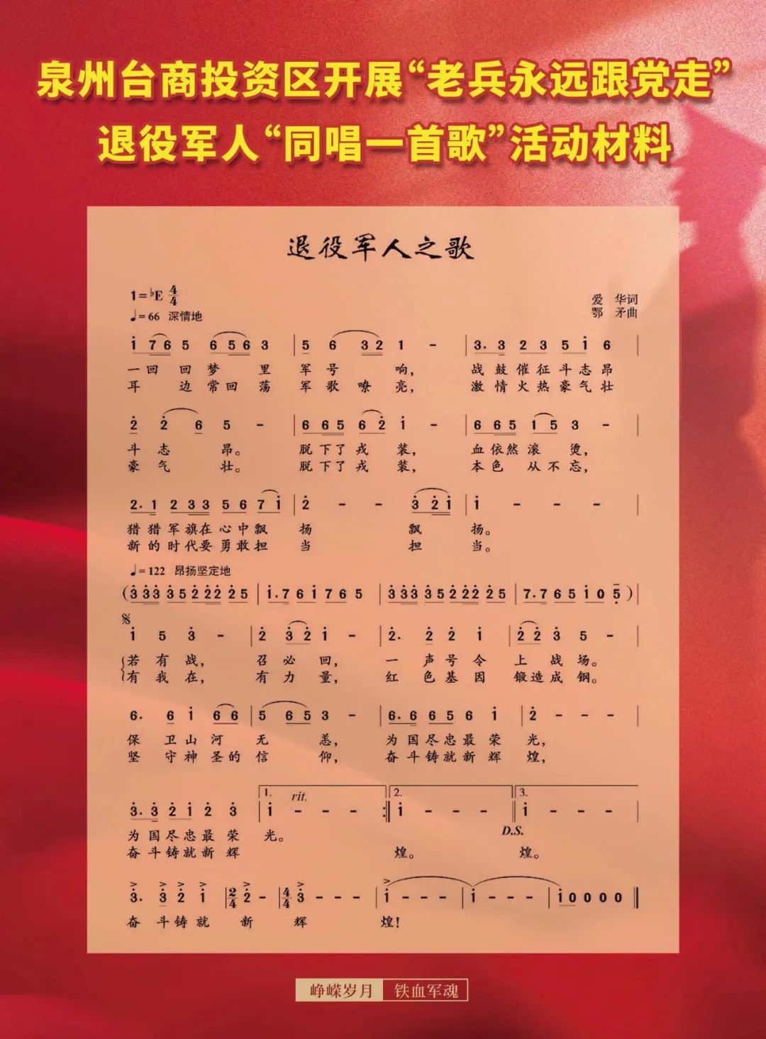 接下来,泉州台商投资区还将采取更多有效措施推进《退役军人之歌》的宣传推广。后续将在全区退役军人中开展合唱比赛、拍摄老兵演唱微视频……进一步铸牢“老兵永远跟党走”的思想根基和行动自觉,着力汇聚起团结奋进、干事创业、开拓创新的强大力量,通过同唱一首歌,进一步凝聚人心、凝聚精神、凝聚士气,唱出力量、唱出团结、唱出干劲,以更加饱满的热情和昂扬的斗志、更加务实的作风,履职尽责,为以中国式现代化全面推进中华民族伟大复兴作出更大贡献、争取更大荣光。