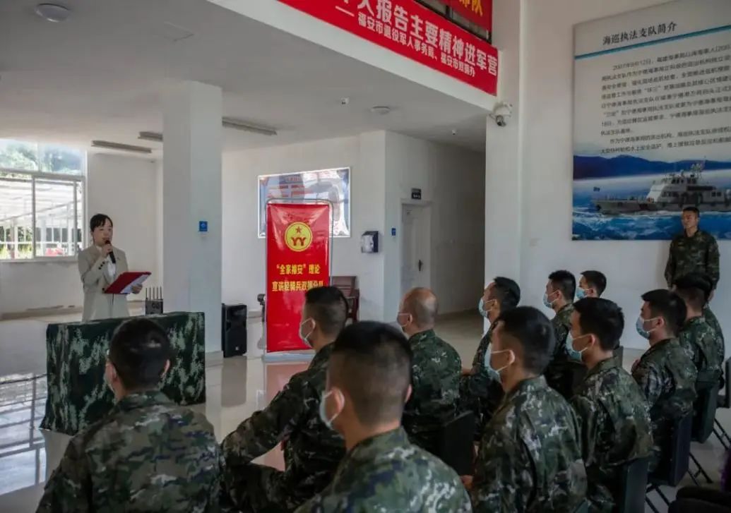 近日,“全家福安”理论宣讲轻骑兵双拥分队走进宁德海警局福安工作站,宣讲党的二十大报告主要精神。活动中,福安市退役军人事务局副局长刘少希、双拥办副主任陈海铃与官兵们围绕“三个务必”“中国式现代化”“学习强军思想、建功强军事业”等主题展开学习、帮助大家进一步了解掌握新理念、新思想。宣讲员钟石木、雷寿玉表演了快板《喜庆二十大奋进新征程》、郭颖等表演了《畲汉一家亲》等节目,以寓教于乐的形式宣讲党的二十大精神,在官兵中引发强烈反响。
