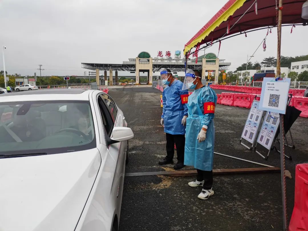 在旧镇高速路口,漳浦县退役军人志愿者服务队6名队员正排查过往车辆,把好关口。诏安县16支退役军人志愿者服务队、450余名退役军人积极响应。在诏安东、诏安南、霞葛镇高速路口,退役军人沈艺彬、吴喜松、沈晓军每夜坚守,把牢疫情防控“前哨”;在林头高速路口,退役军人吴文洪身披白色“战袍”,全力参与核酸采样登记工作,他们合力守好福建“南大门”。
